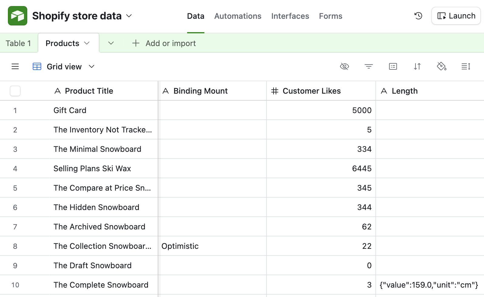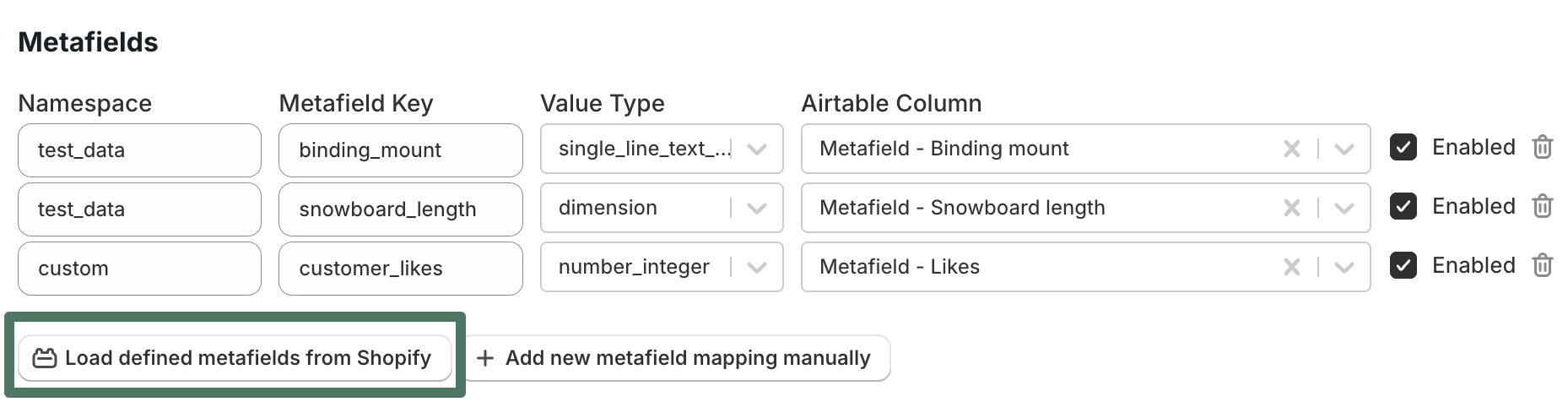 - In Metafields, enable only the metafield(s) you want to write back (e.g., a “customer_likes” count). Point each to the Airtable column holding your edits.