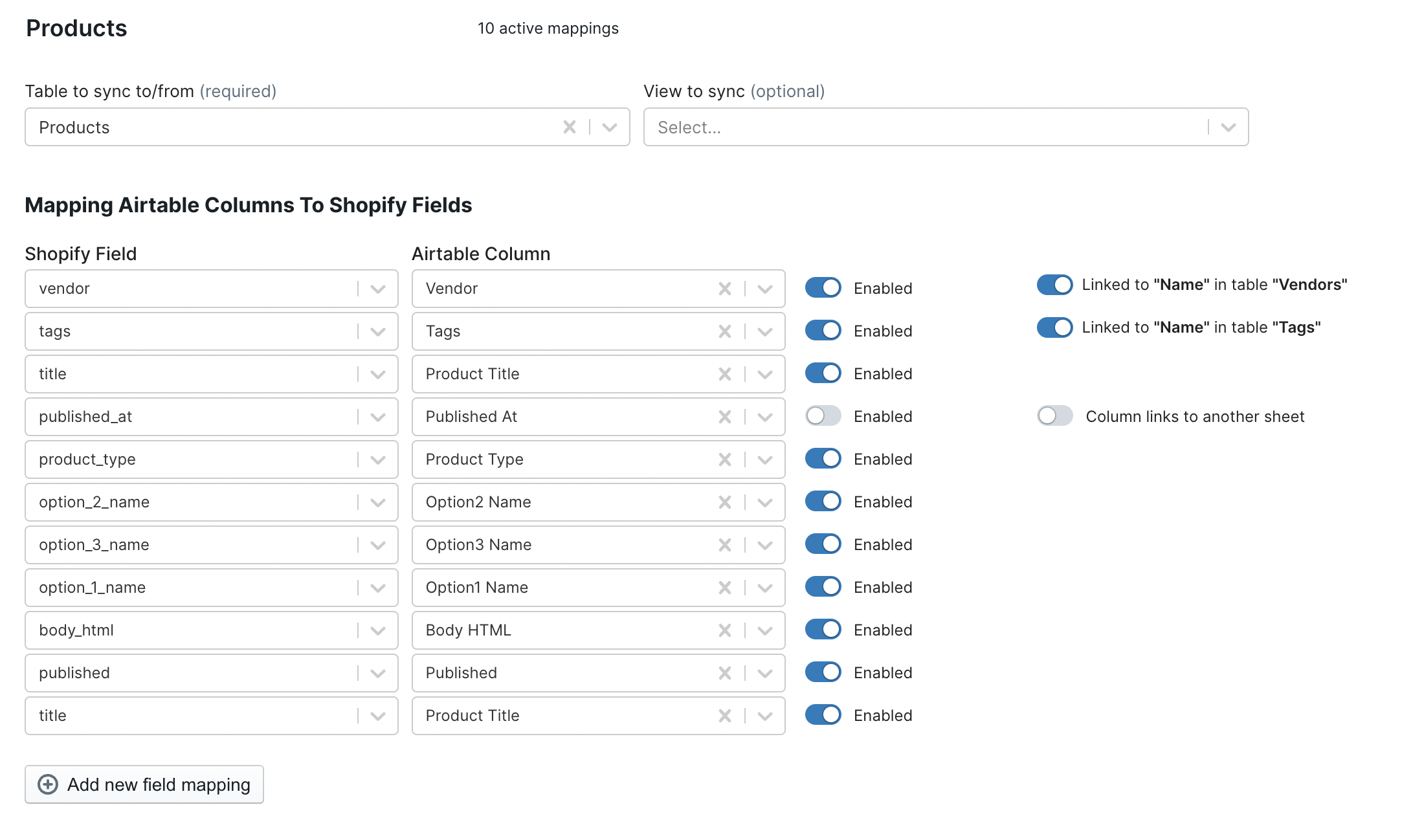 To bulk update products from Airtable to Shopify, first create an Airtable to Shopify sync profile. Open the profile and go to the Data Mapping tab. Open the Products section. Now, ensure that the product fields you want updated are mapped to columns in your base and that the mapping is enabled.