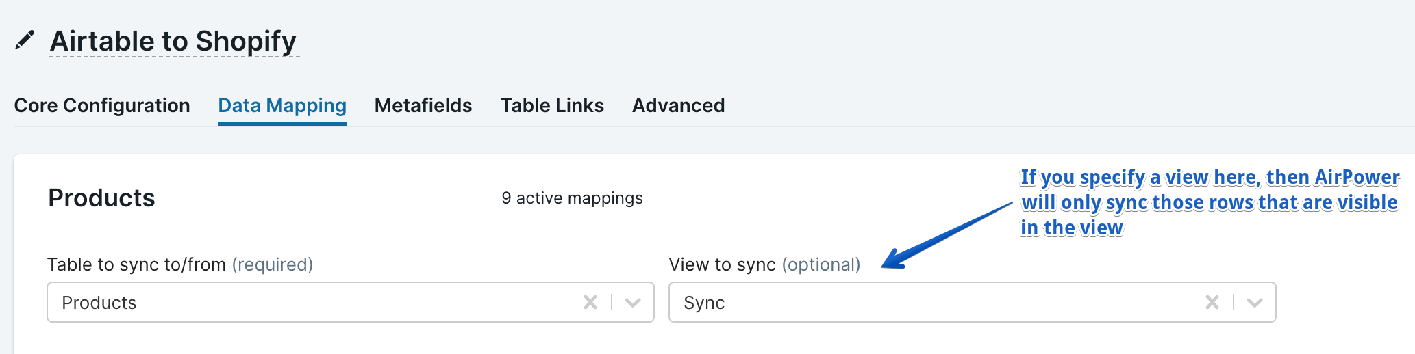 By default, AirPower will pull all the data from every table you’ve elected to sync from Airtable to Shopify (e.g., Products) and sync all relevant fields to Shopify. This may end up taking a long time if you have a lot of data, and is undesirable if you want to update a fraction of your products, for example.