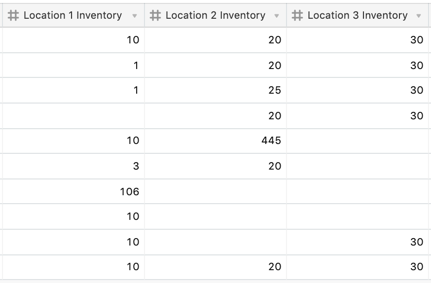 This is the way to set-up inventory syncing if you have multiple variants per product, and therefore your variants live in their own table. AirPower allows you to set up individual columns to track the inventory quantity at each location where the variant is stored. So, for example, if you have three locations you can track a variant’s quantity at each location by modifying the relevant column data for the variant row.